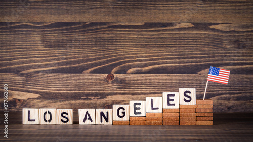 Los Angeles, United States. Politics, economic and immigration concept. Wooden letters and flag on the office desk