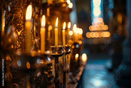 Lots of candles burning in church. Praying in candle light. Festive church decoration.