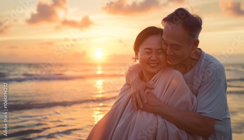 Love and Leisure: A Senior Asian Couple Embraces on the Beach at Sunset