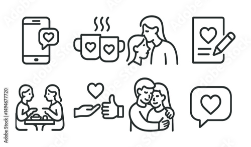 romance, love, couple, outline, linear, icon, set, vector, communication, dating, connection, emotion, nubes, hugs, partnership, bonding, togetherness, harmony, sentiment, affection, devotion, oneness, passion, closeness