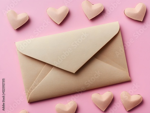 Love letter envelope with paper craft hearts on soft pink background