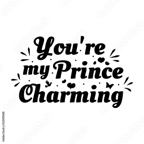 Love phrase “You're my Prince Charming“. Hand drawn typography poster. Romantic postcard. Love greeting cards vector illustration on white background