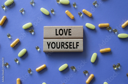 Love Yourself symbol. Concept words Love Yourself on wooden blocks. Beautiful purple background with pills. Mindfulness and Love Yourself concept. Copy space.