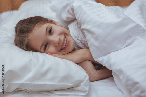 Lovely little happy girl laughing excitedly to the camera, lying in her bed in the morning. Adorable little girl waking up, smiling to the camera. Children, family, happiness concept