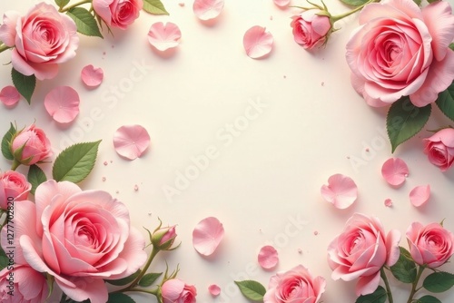 Lovely pink roses and petals arranged in a delicate frame on a soft background