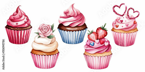 cupcake, february 14, heart, love, pink, sweet, dessert, bakery, watercolor, illustration, romantic, delicious, sugary, frosting, strawberry, rose, cute, adorable, charming, pretty, tasty, treat, confectionery, pastry, food, holiday, celebration, festive, gift, present, candy, sweet, baking, appetising, food photography, high-quality, whipped cream