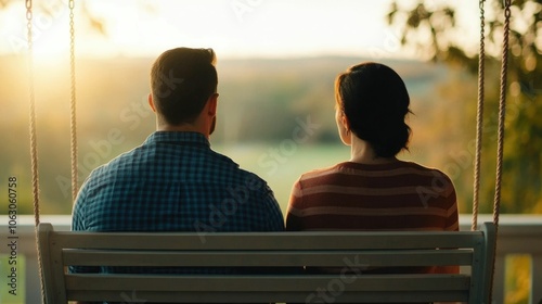 Loving Couple Sitting on a Wooden Porch Swing Cherishing the Peaceful Moments of Their Affectionate Relationship in a Serene Picturesque Pastoral Setting