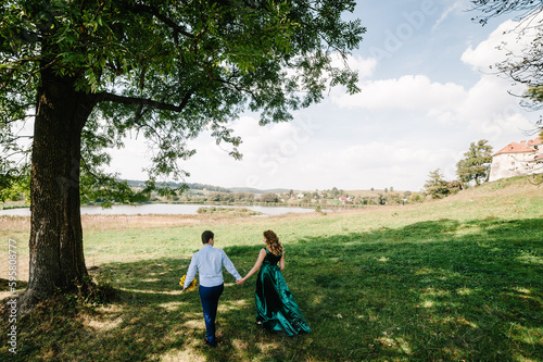 Loving couple standing by the lake and admiring the scenery. Woman and man relax in nature. Family walk together on a sunny summer day. Back view.