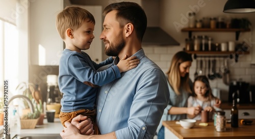 Loving father holding his young son in a bright kitchen, with family members in the background