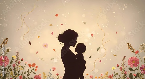 Loving Mother and Baby Silhouette Amidst Flowers. A beautiful silhouette of a mother holding a baby, set against a soft, beige background adorned with delicate wildflowers and falling leaves.