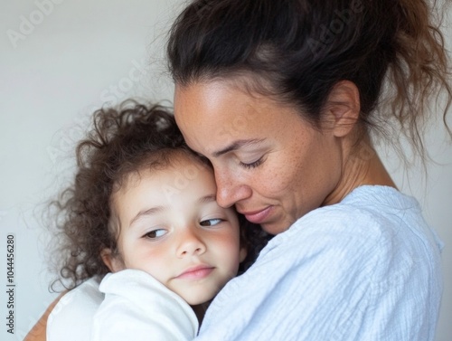 mother, children, hug, hugs, multiracial, family, love, bonding, tenderness, morning, light, togetherness, connection, cosiness, affection, warmth, curly, hair, casual attire, indoor, parenting, motherhood, care, home, intimate, close, up, portrait, young, happy, smiling, soft, gentle, peaceful, content, candid, emotional, natural, freckled, relaxed, serene, protective, nurturing, expressive, heartfelt