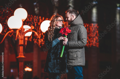 loving young couple walking outdoors in winter. Girl holding a flower