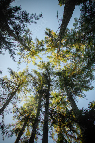 low angle view from the ground to the treetops in the forest