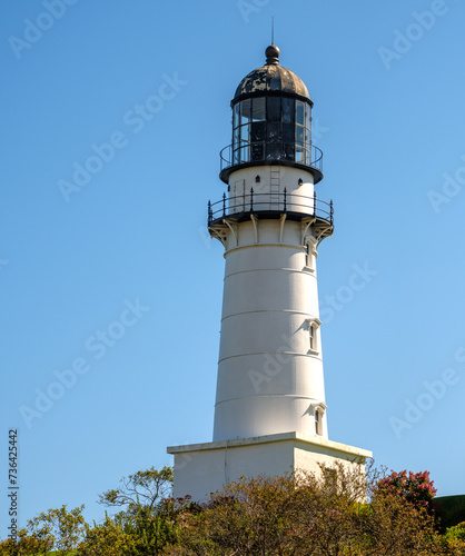 Low angle view of a New England Lighthouse against a clear blue skyNew England