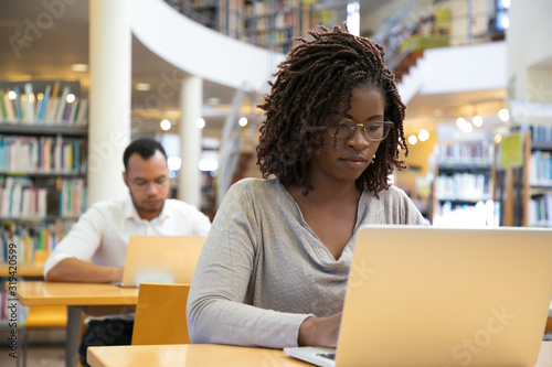 laptop, computer, student, african, american, looking, digital, device, person, young, project, woman, sitting, concentrated, beautiful, learning, education, studying, college, library, study, casual attire, bookshelf, educational, using, tuition, table, typing, prof, teacher, confident, together, blouse, working, technology, learner, public, eyeglass, preparing, blurred background, man, thoughtful, pensive, serious, focused