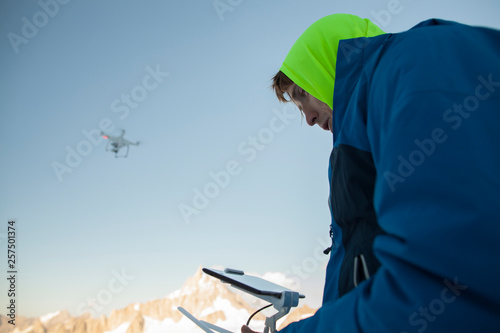 man, mid, adult, caucasian, drone, racked, hold, fly, remote control, control, technology, surveillance, wireless, connection, travel, leisure, lifestyle, sky, low angle, casual attire, alone, outdoors, day, people