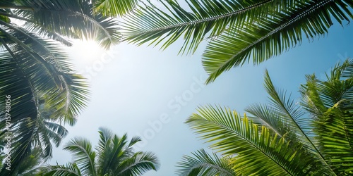 palm, tree, leaf, tropical, sky, blue, sun, sunshine, bright, summer, vacation, holiday, nature, green, frond, exotic, paradise, travel, background, copy space, low angle, looking up, sunny, light, flare, coconut, island, beach, resort, relaxation, serenity, clear, weather, foliage, plant, botanical, environment, landscape, scenic, tour tourism, leisure, heat, warm, vibrant