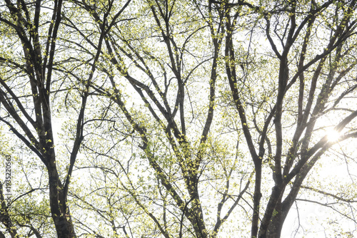 Low angle view of sunlit tree canopy during spring. Fresh green leaf budding on bare branch against bright sky. beautiful, peaceful, and hopeful nature background