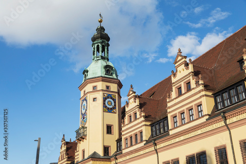 architecture, building exterior, built structure, clock, clock-tower, tower, color image, day, landmark, german, history, national landmark, city, outdoors, renaissance, saxony, sky, summer, sunlight, sunshine, tour tourism, copy space, travel, blue, colours, window, nobody, travel destination, cloud, europa, town, city hall, building, leipzig, photo
