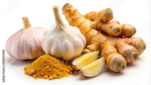 turmeric, root, garlic, ginger, isolated, white background, food, vegetable, spice, ingredient, bulb, white, healthy, fresh, organic, raw, cooking, clove, onion, herb, vegetable, seasoning, spicey, market, agriculture, epicure, nourishment, favor, vegetarian