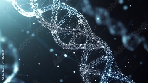 Low Poly Wireframe DNA Helix with Geometric Spirals on Dark Blue Background, Representing Genetics, Science, and Innovation