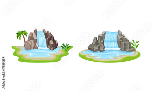 Low Tropical Waterfall with Water Flowing Over Vertical Steep Drop Vector Set