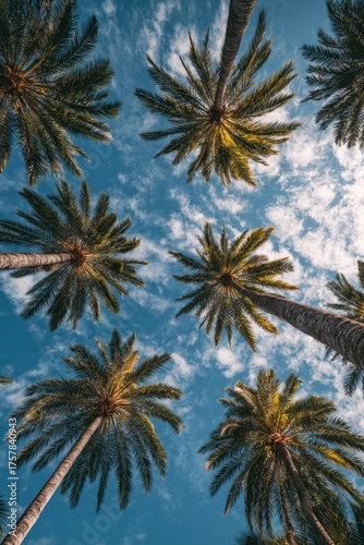 palm, tree, sky, blue, cloud, sun, tropical, summer, vacation, paradise, beach, ocean, green, leaf, nature, vibrant, bright, sunny, warm, upward, low angle, perspective, view, scenic, landscape, exotic, flora, foliage, heaven, relaxing, calm, serene, peaceful, beauty, idylli, escape, holiday, travel, photo, image, picture, vertical, day, sunshine, cloudless, frond
