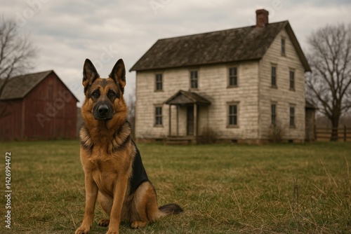german shepherd dog, architecture, farmhouse, guard dog, landscape, building, outdoors, shepherd, shelter, sitting, animal, canino, german, mammal, nature, rustic, sharpened, front, guard, loyal, rural, sharp, image, photo, barn, sora, dog, old, pet