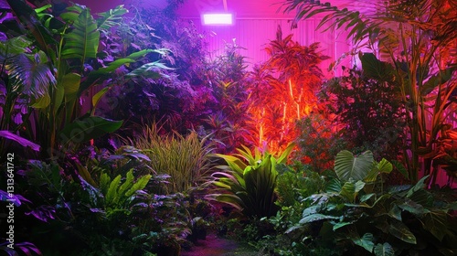 Luminous Tropical Paradise: A Vibrant Garden Under Artificial Light