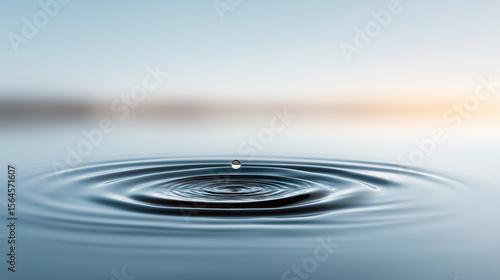 Luminous water droplet splashing, generating symmetrical ripples across serene azure surface, soft sunset lit background highlighting delicate liquid dynamics