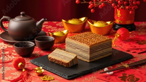 chinese, new, year, cake, lunar, festive, celebration, gold, ingot, red, teapot, cup, tea, offering, gift, tradition, culture, prosperity, luck, happiness, design, ornament, pattern, asia, asian, decoration, cookery, sweet, dessert, food, table, clothes, serving, arrangement, holiday, rich, luxurious, oriental, east, still, life, elegant, delicious, epicure, presentation, event, special, occasion