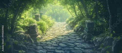 Lush ancient stone pathway surrounded by greenery with historic towers in a serene natural setting.