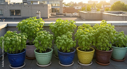 Lush Basil Plants in Colorful Pots on Rooftop Garden Under Soft Evening Sunlight with Urban Cityscape Background