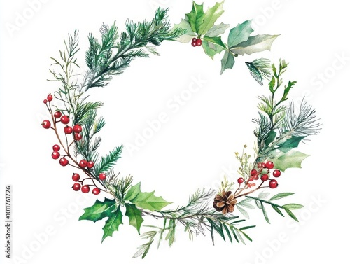 lush botanical wreath intricate arrangement of evergreen sprigs and vibrant berries. festive circular design popping against crisp white background.
