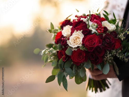 Lush bouquet of vibrant red and delicate white roses arranged artfully on a rustic wooden table creating an elegant and romantic setting for a special occasion such as a wedding anniversary