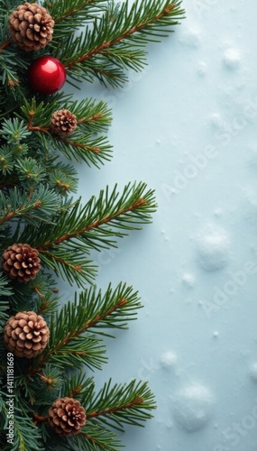 Lush fir branches with rustic pine cones and greenery, set against a snowy background , fir, pinecones, evergreen