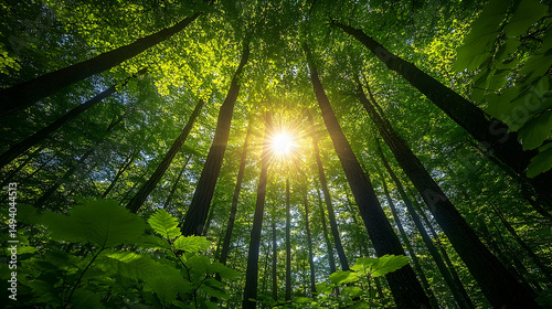 tree, forest, sunlight, canopy, green, leaf, nature, bright, light, wood, daylight, lush, growth, vibrant, summer, foliage, dense, environment, view, perspective, upward, sun, sky, plant, natural, fresh, strong, healthy