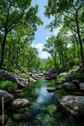 forest, stream, river, tree, rock, water, green, nature, calm, tranquil, sunlight, blue, sky, clear, fresh, landscape, picturesque, peaceful, vital, beauty
