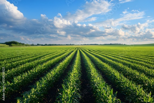 cornfield, corn, maize, agriculture, farming, field, row, green, vibrant, bright, sunny, sky, cloud, blue skies, landscape, rural, countryside, nature, summer, spring, growth, cultivation, planting, harvest