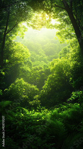 Lush green forest bathed in sunlight, showcasing dense foliage and vibrant nature. A serene and captivating natural landscape.