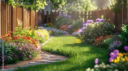 Lush green grass, vibrant flowers, wooden fence, and a sunlit garden path in a summer backyard, highly detailed and photo-realistic