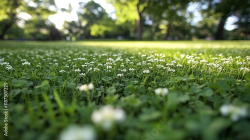 Lush Green Grass with Delicate White Flowers in a Sunny Park