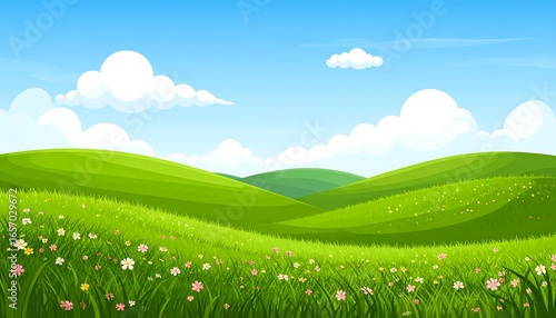 landscape, grassy, hill, sky, cloud, green, flower, spring, nature, beautiful, summer, peaceful, high-coloured, scenic, rolling, gentle, elevated, view, panorama, bright, colourful, floral, tranquil