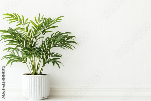 Lush green indoor plant in white ceramic pot on minimal table against clean wall, modern interior decor concept