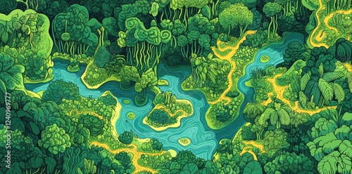 jungle, river, path, tree, green, leaf, forest, aerial, view, lush, vibrant, tropical, vegetation, nature, landscape, rainforest, water, winding, foliage, canopy, branch, root, terrain, ecosystem, biodiversity, wilderness, exploration, adventure, journey, discovery, growth, life, colours, shades, illustration, art, design, map, overhead, perspective, organic, shape, pattern, textured