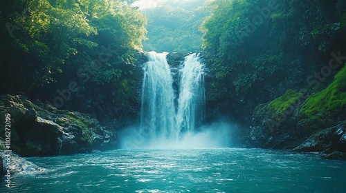 waterfall, nature, jungle, tropical, rainforest, water, cascade, river, green, landscape, scenery, travel, adventure, summer, beauty, scenic, photo, fresh, clean, powerful, flowing, rock, leaf, tree, plant, sunlight, light, blue, pool, calm, serene, peaceful, paradise, wild, environment, ecosystem, energy, vibrant, amazing, breathtaking, view, image, picture, background
