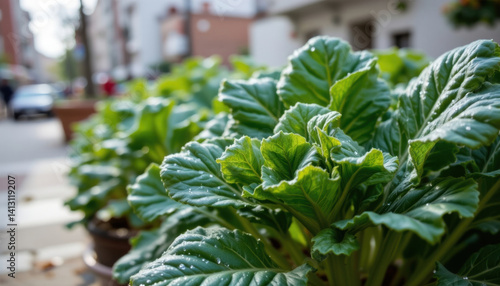 Lush green leafy vegetables with water droplets in urban garden setting, showcasing vibrant growth and freshness