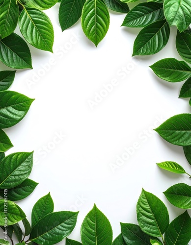 Lush green leaves frame a bright white space. Fresh foliage creates a natural border, perfect for adding text or design elements