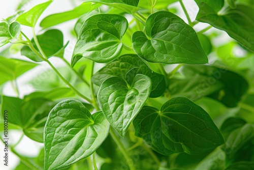 Lush green leaves with heart shapes create a vibrant, natural backdrop, showcasing the beauty of plant life and its intricate textures.