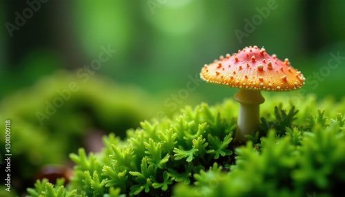 Lush green moss carpet with tiny mushroom caps, mycelium, moss, earthy tones